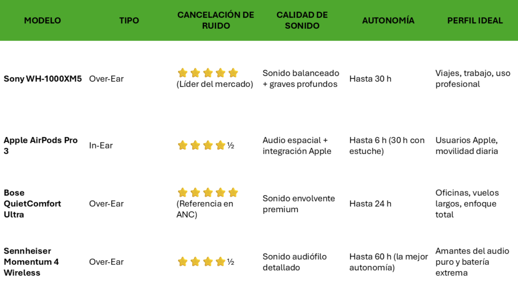 - Cancelación activa de ruido (ANC) referencia del mercado
