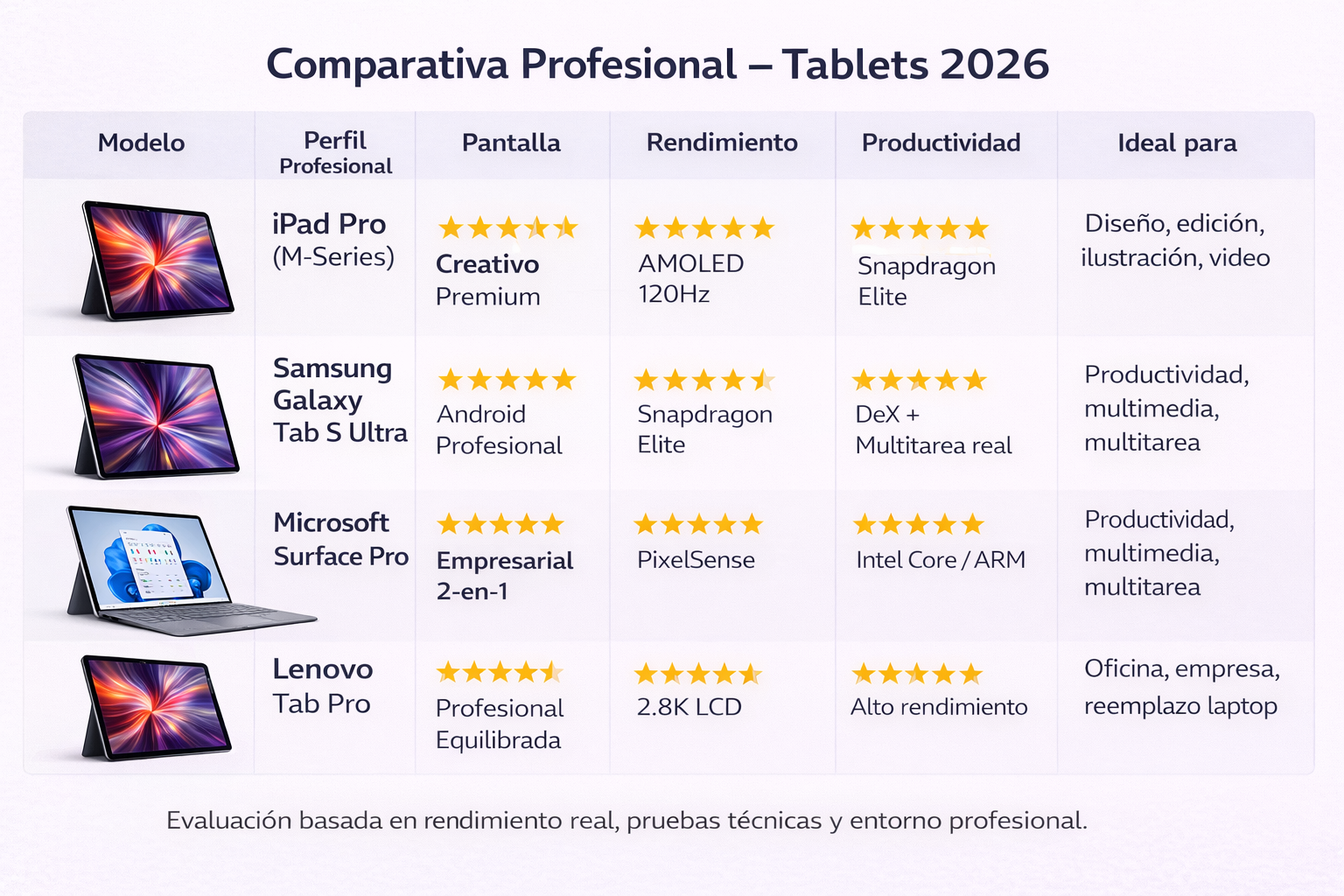 Ya sea para diseño digital, toma de notas avanzada, productividad empresarial, educación profesional o consumo multimedia premium, aquí encontrarás una clasificación clara y objetiva para elegir la tablet ideal según tu perfil.